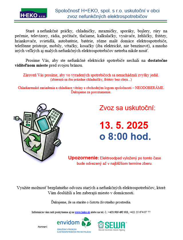 Prosíme Vás, aby ste nefunkčné elektrické spotrebiče nechali na dostatočne viditeľnom mieste pred svojou bránou.